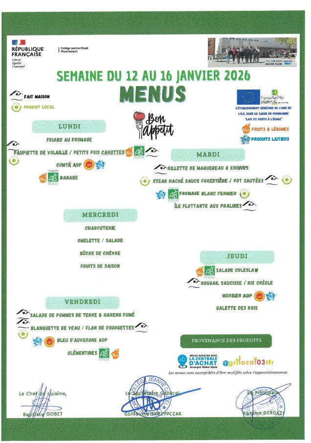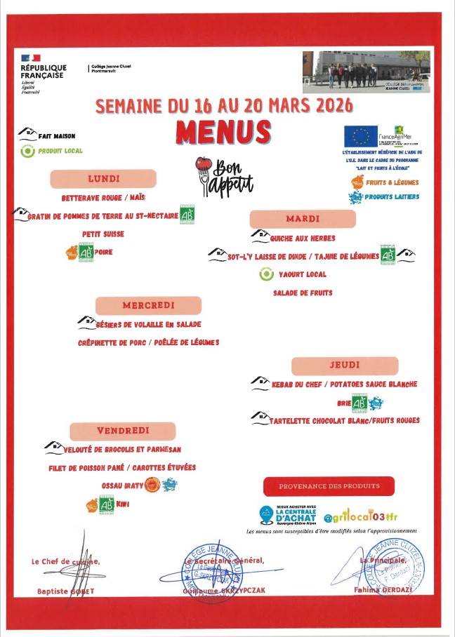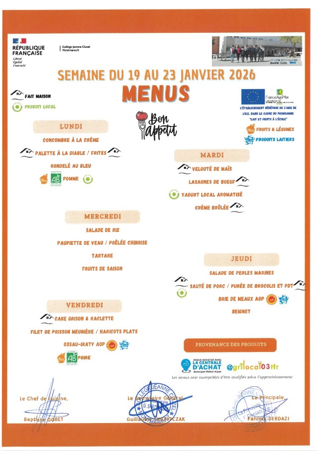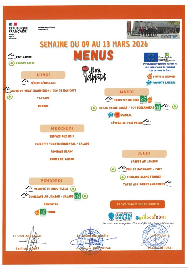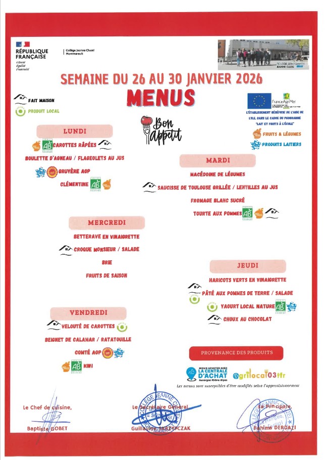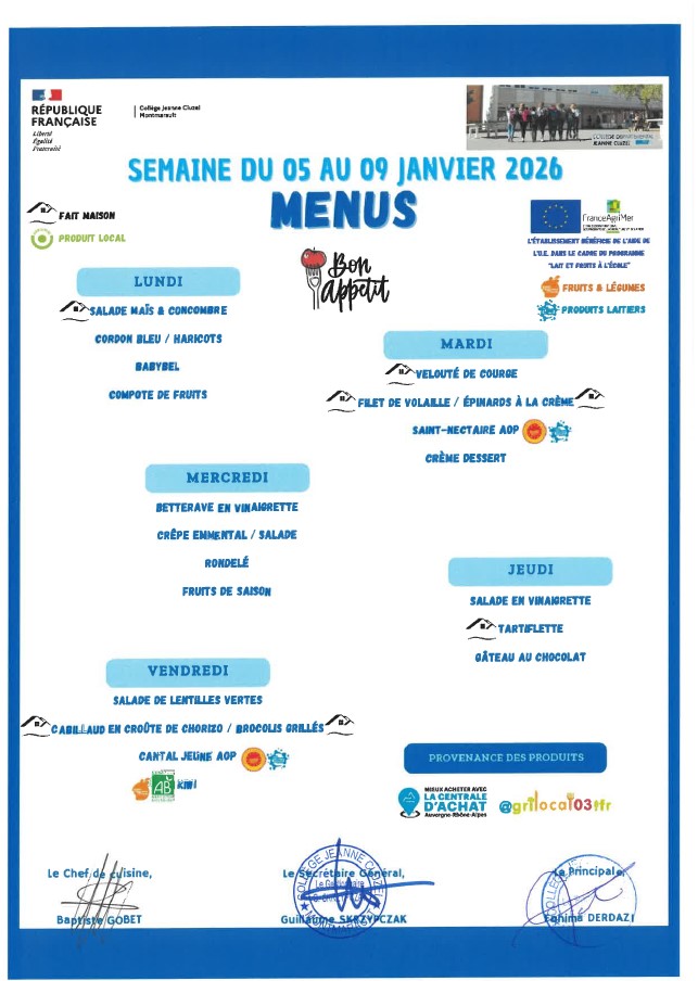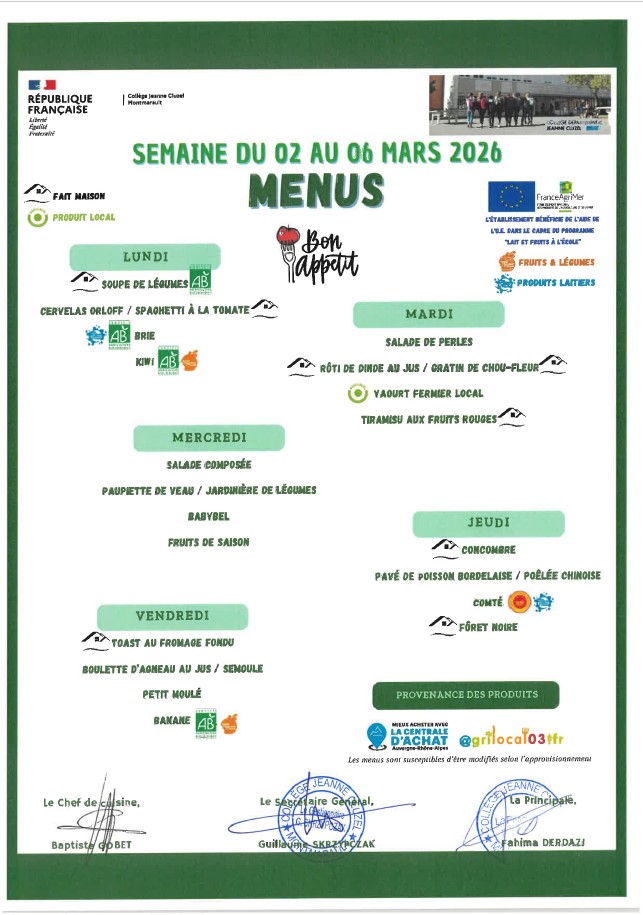Menu de la cantine Menus 2026